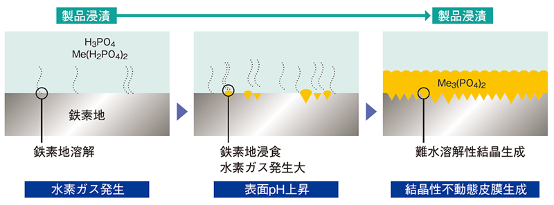 鉄鋼等、金属材料の表面に浸漬法による化学反応によって無機質の皮膜を生成させる処理です、