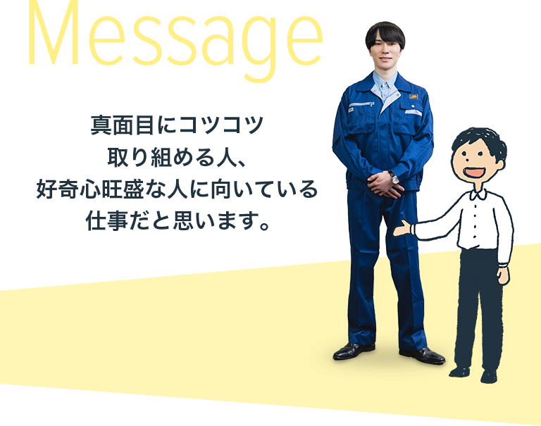 以前、仕事で少し悩んでしまったとき、先輩から「立ち止まらず、手を動かし続けなさい」という言葉をかけてもらいました。その通りだなと今になって思います。モノづくりで大切なことは手を動かし続けることです。将来的にはテクニカルセンターでの開発業務や、普段取り扱わない薬品や材質を用いた試験・分析業務に携わりたいですね。表面処理という技術が持つ無限の可能性を自分自身の手で広げていきたいと思います。少しでも表面処理に興味があるなら、ぜひパーカープロセッシングを目指してください。困ったときに相談しやすく、アットホームな環境が整っています。社員一人ひとりが支え合う働きやすい職場です。