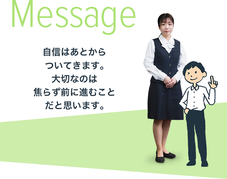 これからは、総務・経理の知識をさらに深めたいと考えています。また、積極的に資格を取得し、スキルアップを目指しています。ここでは組織という堅苦しさを感じることがなく、温かさにあふれています。教育体制が整っており、業務を安心して覚えられるのも大きな魅力ですよ。