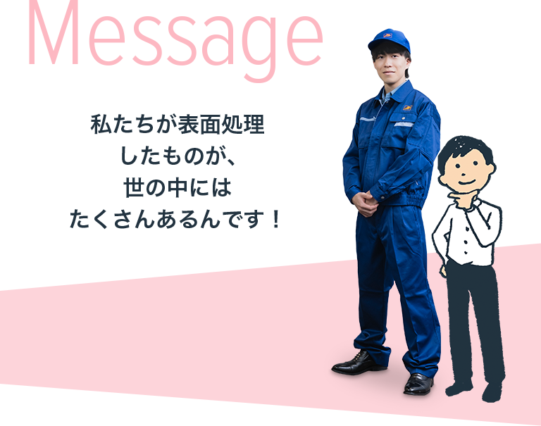 やりがいを感じる瞬間は、お客様から預かった製品をきれいに塗装仕上げできたときですね。また、普段生活する中で、自分が表面処理に携わった製品を見かけると、なんだか誇らしい気持ちになります。